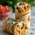 These Air Fryer Southwest Chicken Burritos are a delicious and easy-to-make meal featuring shredded rotisserie chicken combined with cream cheese, cheddar, black beans, corn, and tomatoes seasoned with taco spices. Wrapped in flour tortillas and crisped to perfection in the air fryer, these burritos are perfect for a quick lunch or dinner served with sour cream and extra pico de gallo for garnish.