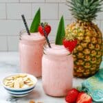 - Combine Ingredients: In a blender, add the unsweetened coconut milk, frozen strawberries, frozen pineapple, white chocolate chips, and honey (or vegan alternative).