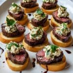 This Beef Tenderloin Gorgonzola Crostini recipe combines tender, flavorful beef tenderloin with creamy, tangy Gorgonzola cheese atop crisp baguette slices. Ideal as an elegant appetizer or party snack, these crostini offer a delightful balance of savory meat, rich cheese, and a touch of balsamic vinegar with fresh parsley garnish.