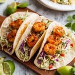 These Cajun Shrimp Tacos with Creamy Slaw offer a perfect blend of spicy, tangy, and creamy flavors. Succulent shrimp seasoned with bold Cajun spices are quickly sautéed and paired with a zesty and refreshing slaw made from crisp coleslaw mix, jalapeño, red onion, and cilantro mixed in a creamy lime dressing. Served on warm flour tortillas, these tacos are a quick, easy, and delicious meal perfect for any day of the week.