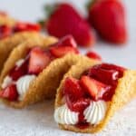 These Cheesecake Tacos are a delightful dessert treat featuring crispy graham cracker-coated tortilla shells filled with a creamy cheesecake filling and topped with fresh strawberries in a sweet strawberry glaze. Perfect for parties or a fun twist on traditional cheesecake.