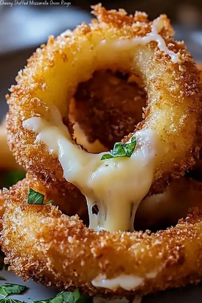 These Cheesy Stuffed Mozzarella Onion Rings are a delicious twist on classic onion rings, with gooey melted mozzarella cheese inside. They are crispy on the outside and cheesy on the inside, making them a perfect appetizer or snack for any occasion.
