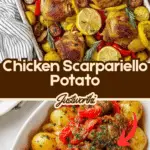 Chicken Scarpariello is a hearty Italian-American dish featuring bone-in chicken thighs and spicy Italian sausage cooked with baby potatoes, tangy pickled cherry peppers, and a flavorful sauce made from white wine, chicken broth, and aromatic herbs. This rustic meal is vibrant with the zing from vinegar and the heat from red pepper flakes, perfect for a comforting yet bold dinner.