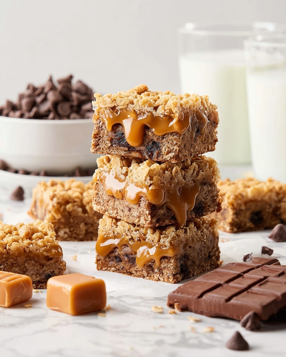 The image shows a stack of three dessert bars, each with three visible layers: a crumbly golden oat layer on top, a middle layer with melted chocolate chunks and caramel sauce dripping down, and a bottom layer of dense oat texture. Around the stack are more bars with the same layers, scattered chocolate chips on the white marbled surface, and caramel squares. In the background, there is a white bowl filled with chocolate chips and two glasses filled with milk. The whole scene is set on a white marbled surface with soft, natural lighting, photo taken with an iphone --ar 4:5 --v 7