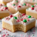 - Frost the Bars: Once the cookie bars have completely cooled, spread the frosting evenly over the top. Decorate with Christmas sprinkles as desired.