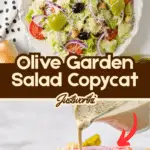 This Copycat Olive Garden Salad recipe recreates the fresh and zesty Italian salad you love from Olive Garden. It features crisp iceberg lettuce, pepperoncini peppers, ripe Roma tomatoes, black olives, thinly sliced red onions, crunchy seasoned croutons, and freshly grated Parmesan cheese, all tossed in a tangy, creamy Italian dressing bursting with garlic, herbs, and a hint of heat.