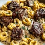- Combine the Ingredients: Slice the seared steak into bite-sized pieces. Return the steak and cooked tortellini to the skillet, tossing gently to coat everything in the creamy sauce. Cook together for about 2 minutes to warm through and meld flavors.