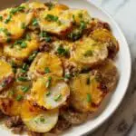 - Layer in Crockpot: In the crockpot, start by layering half of the sliced potatoes. Next, add half of the cooked beef and onion mixture, followed by a portion of shredded cheddar cheese. Repeat the layering with the remaining potatoes, beef, and cheese.