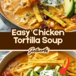 Easy Chicken Tortilla Soup is a comforting, flavorful dish perfect for quick weeknight dinners. This delicious soup combines shredded chicken, tomatoes, beans, corn, and aromatic spices, simmered together to create a rich and hearty meal. Topped with crispy tortilla strips, creamy avocado, sour cream, and melted Tex-Mex cheese, it delivers a delightful blend of textures and tastes in every bowl.