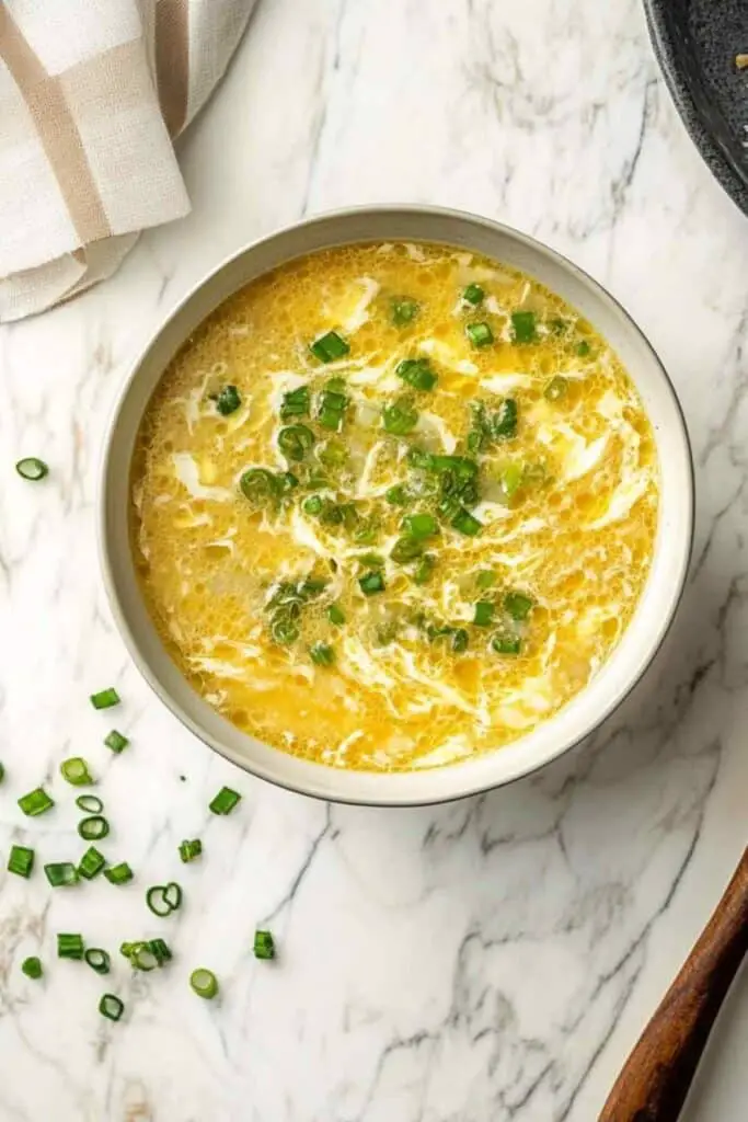 A comforting and flavorful Chinese soup made with silky ribbons of beaten eggs in a savory chicken broth, seasoned with soy sauce and sesame oil.