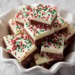 This Festive White Chocolate Fudge recipe features two luscious layers: a rich semi-sweet chocolate fudge base topped with a creamy white chocolate layer adorned with colorful Christmas sprinkles. Perfect for holiday gifting or a sweet festive treat, this no-bake fudge is easy to prepare and delightfully indulgent.