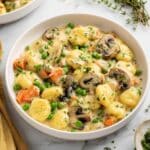 This Gnocchi Chicken Pot Pie is a cozy and festive dinner option that combines tender rotisserie chicken, creamy mushroom sauce, and soft potato gnocchi. Made with wholesome ingredients like fresh thyme, cremini mushrooms, and a medley of peas and carrots, this comforting dish is perfect for a hearty meal that feels like a classic pot pie without the crust. The creamy chicken soup and rich chicken stock blend give it a luscious texture and deep flavor, while the gnocchi adds a delightful twist, creating a satisfying one-pot dinner that’s easy to prepare and perfect for sharing.