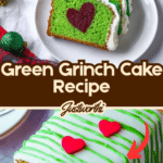 The Green Grinch Cake is a festive and playful layered dessert perfect for holiday celebrations. Featuring vibrant red velvet and pistachio-flavored green cake batters combined in a heart shape, this cake is completed with colorful white and green icing and topped with red heart sprinkles to capture the whimsical spirit of the Grinch.