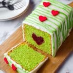 The Green Grinch Cake is a festive and playful layered dessert perfect for holiday celebrations. Featuring vibrant red velvet and pistachio-flavored green cake batters combined in a heart shape, this cake is completed with colorful white and green icing and topped with red heart sprinkles to capture the whimsical spirit of the Grinch.