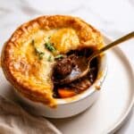 This Guinness Braised Beef Pot Pie features tender beef brisket slow-cooked in a rich stout beer and beef broth sauce with mushrooms, carrots, and herbs, all encased in a flaky sour cream pie crust. Perfect for hearty, comforting meals, this recipe balances deep, savory flavors with a crisp, buttery crust.