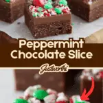 - Serve: Once set, remove from the fridge, lift the slice out using the parchment paper, and cut into squares or rectangles. Serve chilled and enjoy this festive peppermint chocolate delight.