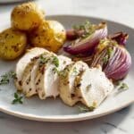 This Perfect Roast Chicken and Veggies recipe features a whole chicken seasoned with aromatic spices and roasted to golden perfection alongside baby potatoes, red onion, and garlic. The combination of fennel and crushed red pepper adds a subtle kick to the tender chicken, while fresh thyme enhances the roasted vegetables, making this a well-rounded, comforting meal perfect for any occasion.