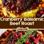 This slow-braised beef roast is a comforting and flavorful dish featuring a tender beef chuck roast cooked low and slow in a savory broth, then finished with a tangy and sweet cranberry balsamic glaze. Perfect for a cozy family dinner, the roast absorbs aromatic herbs and garlic, while the glaze adds a vibrant twist with fresh cranberries, balsamic vinegar, and brown sugar.