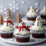 Delightfully festive Snowman Cupcakes featuring rich chocolate sponge topped with creamy buttercream and decorated with fondant, marshmallows, and pretzels to create adorable snowman faces. Perfect for holiday parties or a fun winter treat.