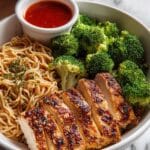 A flavorful and spicy garlic chicken and broccoli noodle bowl that’s quick to prepare and perfect for a satisfying weeknight meal. Tender chicken, crisp broccoli, and savory noodles are combined with a vibrant chili paste and garlic sauce, creating a deliciously balanced dish with a spicy kick.