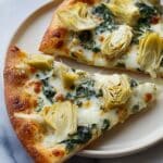 This Spinach Artichoke Pizza combines a creamy spinach béchamel sauce with tender artichoke hearts and a blend of provolone, mozzarella, and parmesan cheeses on a perfectly baked pizza crust. The unique béchamel base adds a luscious texture and savory flavor, making it a delicious twist on the classic artichoke dip, transformed into a satisfying, gourmet homemade pizza.