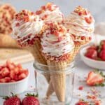 - Garnish and serve: Top each filled cone with diced fresh strawberries and sprinkle 2 tablespoons of reserved strawberry crunch over the strawberries for added texture and flavor. Serve immediately or refrigerate for up to 2 hours before serving to keep the filling firm and fresh.