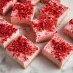 - Assemble the Brownies: Once the brownies have completely cooled, spread the cream cheese frosting evenly over the top. Sprinkle the strawberry shortcake crumble generously over the frosting, pressing lightly to help it adhere.