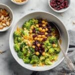 - Combine the salad: In a large mixing bowl, add the finely chopped broccoli, shredded carrots, rinsed chickpeas, toasted almonds, dried cranberries, chopped green onions, and cilantro. Pour the prepared curry tahini dressing over the salad and toss thoroughly until all ingredients are evenly coated.