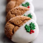 These White Chocolate Dipped Gingersnap Cookies offer a delightful holiday treat combining the spicy warmth of classic gingersnap cookies with the sweetness of creamy white chocolate. The cookies are perfectly crisp yet chewy, enhanced by the festive touch of holly berry sprinkles, making them a charming addition to any holiday cookie platter.
