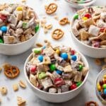 - Prepare the mix base: In a large mixing bowl, combine the Corn CHEX cereal, Cheerios, mini pretzel twists, dry roasted salted peanuts, and 2 cups of M&M’s candies. Mix gently until evenly distributed.